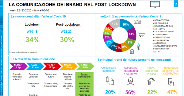 Relativamente al mese di maggio, che è coinciso con l’allentamento delle limitazioni, si è registrata una ripresa dell’acquisto di spazi pubblicitari in tv, radio e quotidiani da parte degli investitori, puntando su linguaggi positivi e di ritorno alla normalità. I brand continuano a manifestare empatia verso i propri clienti, tant’è che quasi un terzo delle nuove creatività televisive include ancora riferimenti al Covid19, ma i messaggi sono cambiati e l’ottimismo è più al centro della comunicazione. Anche i settori più creativi dal punto di vista della comunicazione sono diversi