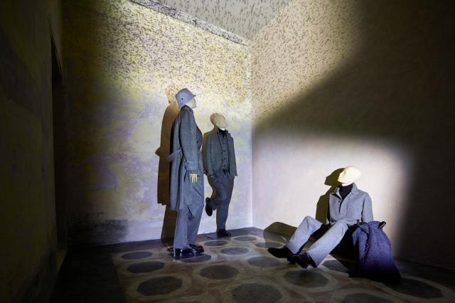 L’abito è reso meno formale attraverso l’inserimento, in modo discreto, di un elastico in vita e tramite la struttura delle spalle, ampiamente ridotta. La sartoria ibrida e decostruita include anche un abito in lana super 210, color blu notte, un “abito da lavoro” composto da field jacket e pantaloni in leggerissimo cashmere spigato e un “abito da jogging” in cotone e cashmere grigio spigato double face, con camicia rugby. Le calzature presentano una costruzione robusta ma sono al contempo leggere, come risulta dagli stivali in pelle di alce e in coccodrillo.