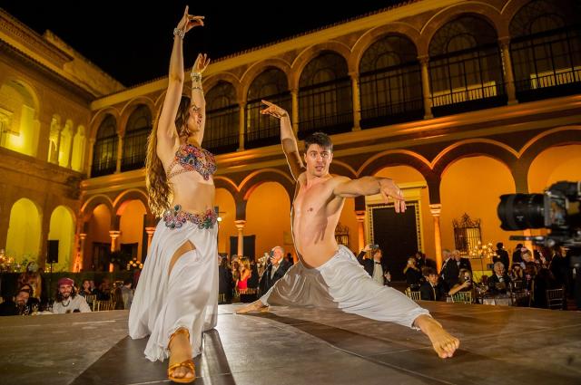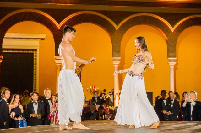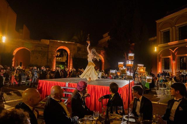 Quello che fu il set de Le Crociate -Kingdom, il kolossal di Ridley Scott, ha fatto da coreografia al piu’ uao dei balli Di Meo. Da una colonnata in marmo e mosaici, al giardino delle meraviglie, da un patio che si infila dentro un altro, alla piscina sotto una simmetria di volte, cascate e giochi d’acqua. Nel grande cortile, è servito il dinner placè, si affaccia dalla balconata la famosa soprano Carmen Giannattasio e delizia il palato mai sazio di datteri farciti di paestry con le note della Carmen. Sul palco piazzato al centro si alternano la sinuosissima ballerina di danza dei sette veli Silvia Brazzoli e Giulio Dilemmi, il Roberto Bolle della danza del ventre, ma lui la chiama Tribul Fusion Belly Dance. Poi ancheggiando sinuosamente scende tra gli ospiti. Il Lato B a distanza ravvicinata manda il parterre in delirio.