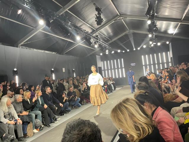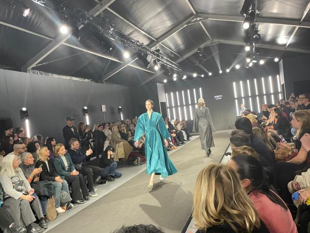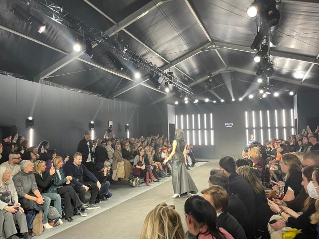 Le iconiche linee essenziali scorrono su velluti di cotone e sete, dal sapore retrò, accostati a tessuti plastici, come il neoprene, disegnando statue in movimento. Colori neutri, verde, blu, grigi e neri sottolineano plasticamente l’artigianalità visionaria della maison.