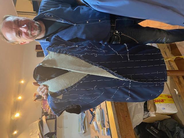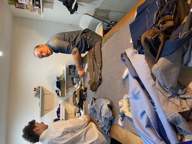 Nel suo laboratorio non c’è traccia di macchina da cucire, lui fa tutto a mano, carta modelli, taglia e cuce. Per le sue giacche dal taglio a aplómb in lino di canapa, azzurro Napoli, ha la fila. Siccome lui è padre e madre di una nidiata di tre bambini dai 7 ai 3 anni il resto del lavoro lo porta a casa a dargli una mano mamma Giuseppina e le tre sorelle, Cristina, Anna e Brunella.