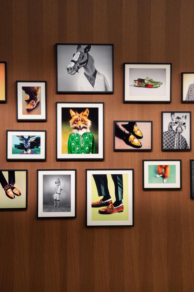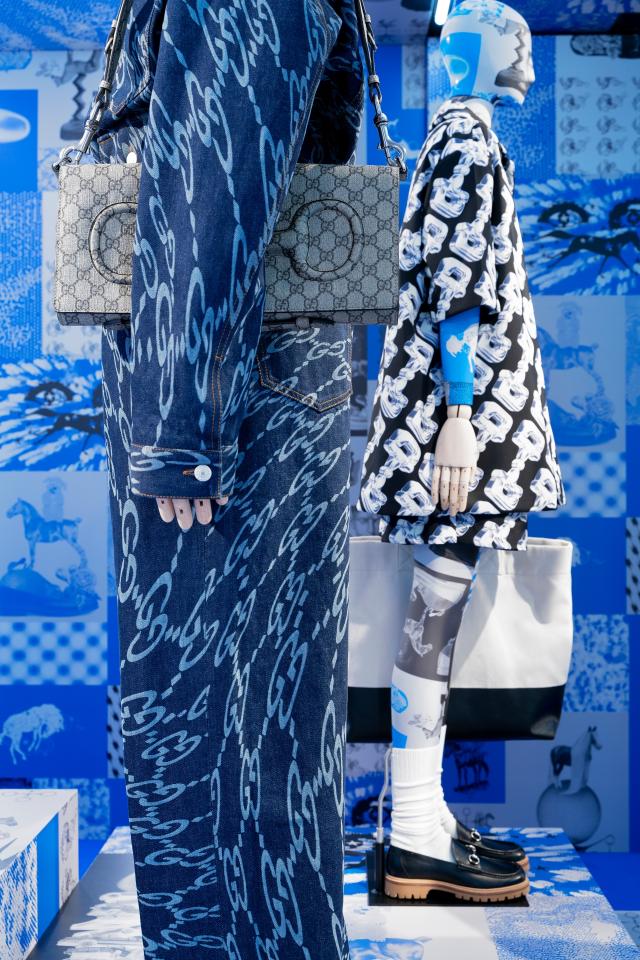 La lunga cabina armadio, rivestita dal pavimento al soffitto con una carta da parati a collage realizzata dal creatore di immagini australiano Ed Davis, presenta le anticipazioni della moda gucciana della prossima stagione primavera-estate 2024.