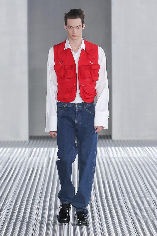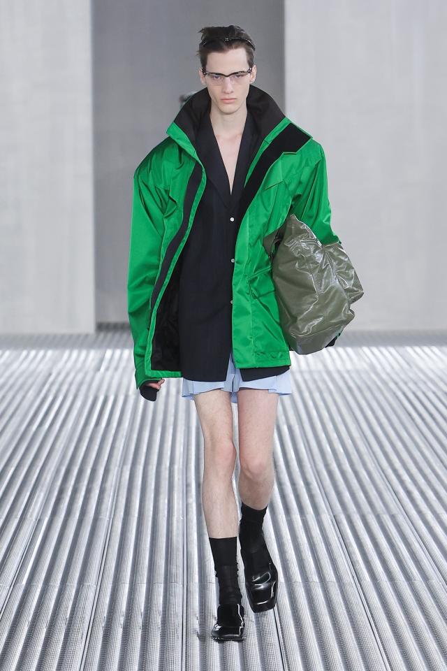 Prada parte proprio da questo essenziale indumento e simbolo per iniziare a rivedere l’intero guardaroba, impermeabili, gilet tecnici, bermuda e pantaloni, in una revisione malleabile e duttile che approda anche ad un originale lavoro di decori, stampe e ricami.
