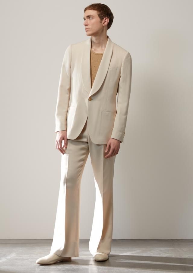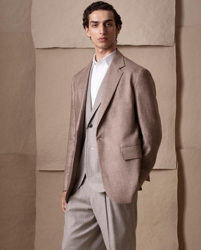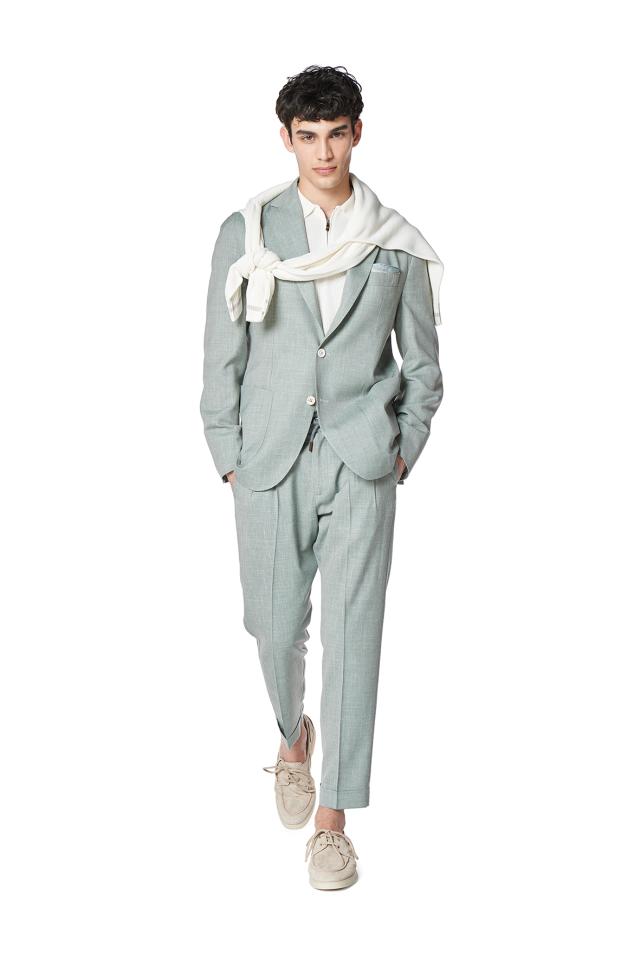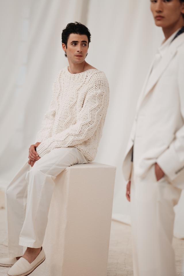 In mostra gli archetipi intramontabili del menswear replicati in materiali organici e certificati (twill di lino, lana tech, jersey, cotone piqué, viscosa e cotone mouliné, chevron di lana, lino e seta).
