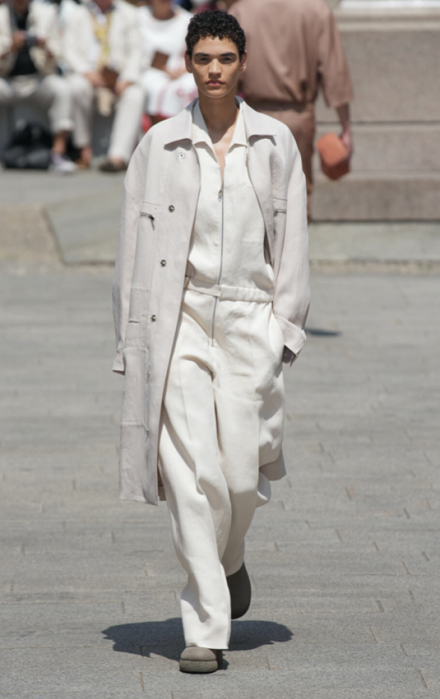 Zegna ricrea la sua oasi in centro città dove far sfilare il nuovo cashmere estivo, ovvero il lino, fibra nobile e sostenibile che si può trattare con finezze o armature più strutturate. Silhouette essenziali, sagomate con bottoni a pressione nascosti all'interno delle giacche fluide come camicie, infilate nei pantaloni del completo da uomo.