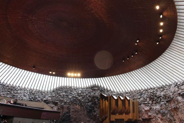 Molto suggestiva la chiesa nella roccia. La forma dall’alto ricorda quella di un disco volante. Temppeliaukio, questo il suo nome finlandese, è una chiesa luterana realizzata nel 1969 da due fratelli architetti, Timo e Tuomo Suomalainen. Di forte impatto il contrasto tra la pietra grezza e la cupola formata da 22 chilometri di fili di rame, le luci delle vetrate e l’acustica. La chiesa non ha le campane: il suono viene riprodotto attraverso un altoparlante affisso sui muri esterni.