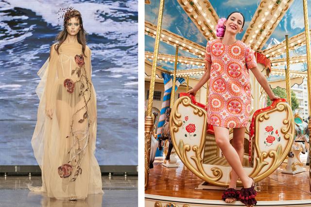 Vestiti costruiti con i dettami dell’alta moda, caftani e vestaglie evanescenti, tailleur sartoriali maschili strizzati in vita, gonne e camicie decorate con macramè, perline, ruches, e mazzi di rose posati su abiti e corsetti sensuali e trasparenti.