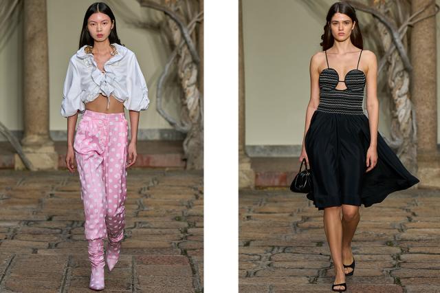 Micro e macro pois, oblò, cuori, fiocchi e fiori, decorano ball dress, top, pantaloni e altre proposte della sfilata di Vivetta Ponti, couturier che fa della lavorazione e del dettaglio il punto focale della seduzione di un abito e di un accessorio.