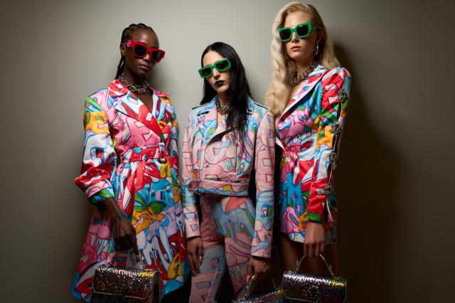 La collezione sfoggia mini-abiti dal fascino drammatico e stampe graffiti iconiche che trasmettono un messaggio di audacia e sicurezza. L'uomo Plein indossa eleganti abiti ispirati alla Pop Art con pattern graffiti a bolle e dettagli arricchiti da stampe di fiamme rosse.