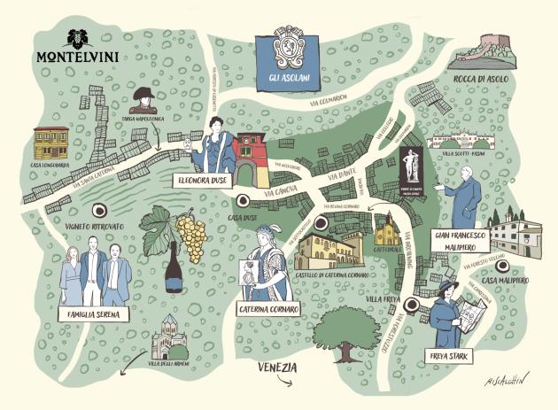 La Famiglia Serena della cantina Montelvini, viticoltori nel territorio dal 1881, ha tracciato in una mappa questo speciale modo di viaggiare attraverso le arti locali, in un progetto che unisce territorio e vigna al patrimonio naturale, artistico e storico, a cui la famiglia appartiene da generazioni e vuol raccontare tramite cinque personaggi illustri.