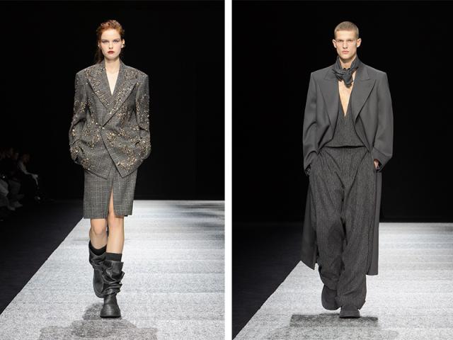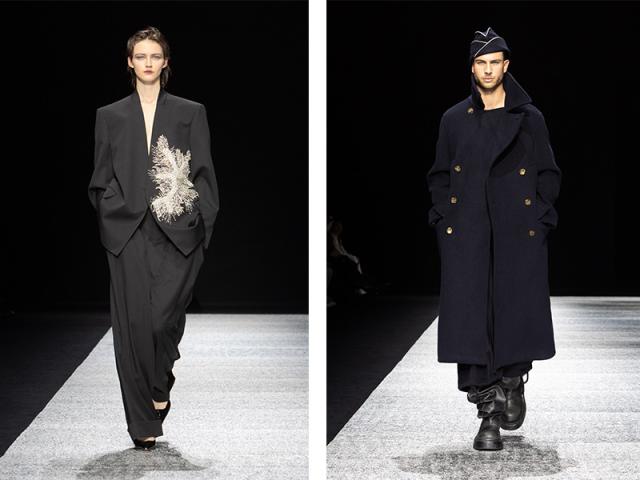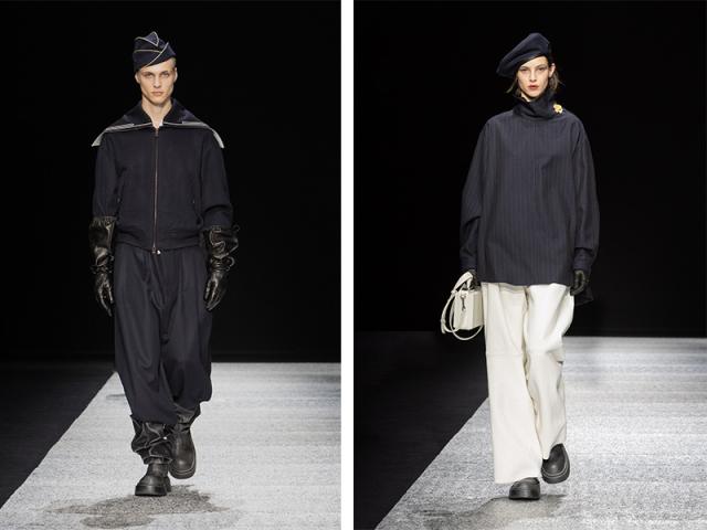 A lui e a lei piacciono le divise e le uniformi più eleganti, ingentilite nelle silhouette, un passaggio fluido tra maschile e femminile: lunghi cappotti, pantaloni confortevoli, casacche da marinaio, gilet e camicie, giacche e giacconi militari, pastrani da traversata.