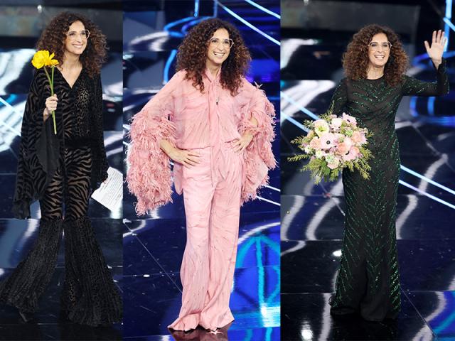 Co-conduttrice della terza serata di giovedì 8 febbraio al Teatro Ariston, l’artista comica Teresa Manninoindossa ben cinque look di Roberto Cavalli realizzati appositamente dal direttore creativo Fausto Puglisi. Il primo è nei toni del bianco, camicia in chiffon di seta stampata e piume con pantalone abbinato, mentre verde è il secondo, a stampa giaguaro e tigre, con sempre una camicia ad ampie maniche a campana e dei pantaloni a zampa d’elefante. Toni rosati per la terza camicia e il pantalone e altro motico giaguaro e tigre ma total black per il quarto defilè camicia-pantaloni a zampa.