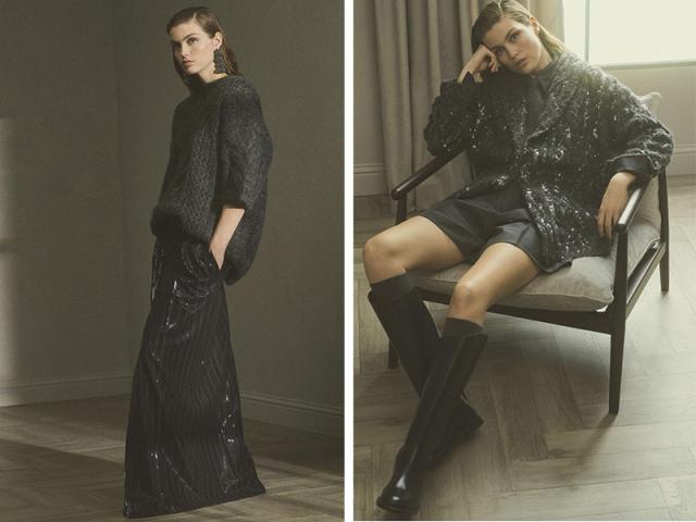 Il mondo maschile formale e sartoriale e la ricerca di un ordine naturale incontrano tessuti, proporzioni e colori essenziali, scelti per il codice estetico urbano di Brunello Cucinelli. Una sintesi discreta e raffinata per il giorno, più glamour la sera dove effetti lucenti, ricami di paillettes e piume decorano abiti e tuxedo.