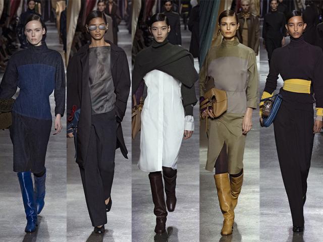 Rilaborati da Kim Jones, direttore artistico di Couture e Womenswear Fendi, gli stili britannici, da quelli più eleganti alle sottoculture, incontrano le divise lavoro e gli accessori selleria romani. Abiti arrotondati e stretti in vita, di un comfort sontuoso, si abbinano a stivali da equitazione e borse morbide.
