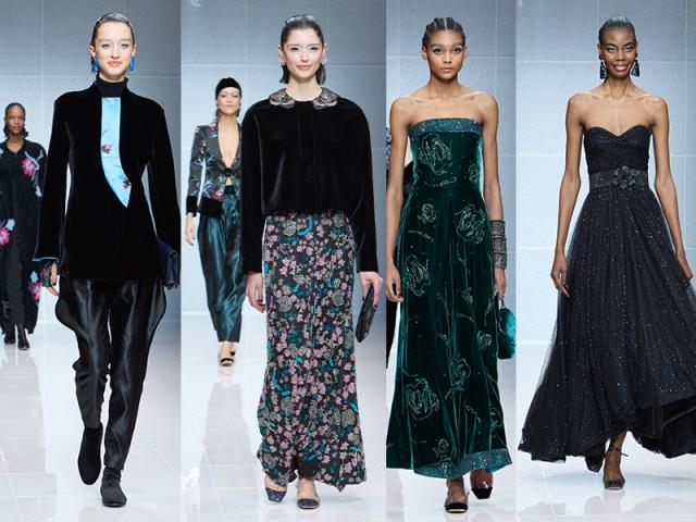 Regale, a tratti orientale, la moda di Giorgio Armani ha la musa di stagione, Gina Di Bernardo, volto degli anni ’80 e ’90. Fiori che sbocciano sui vestiti dell’inverno, declinati in blu notturni e neri intensi o verdi scuri, sempre luminosi e con decori e ricami d’alta sartoria. Giacche e cappotti uniti in alternativa a top e pantaloni liquidi.
