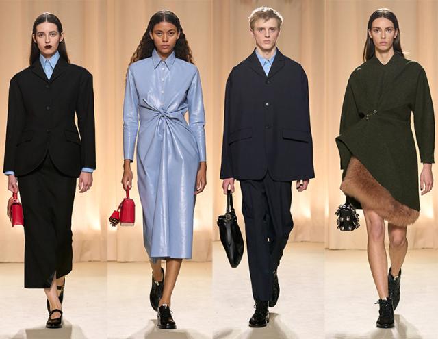 Miuccia Prada e Raf Simons partono da antefatti di moda in epoche diverse per modellare storie e uniformi del presente. Silhouette attillate e verticalità esperata dagli accessori, mentre i tradizionali materiali maschili vengono rilavorati fino a renderli intrinsecamente femminili. Con una domanda intrinseca sui cliché che attraggono e persistono.