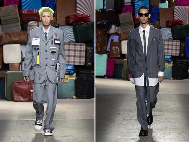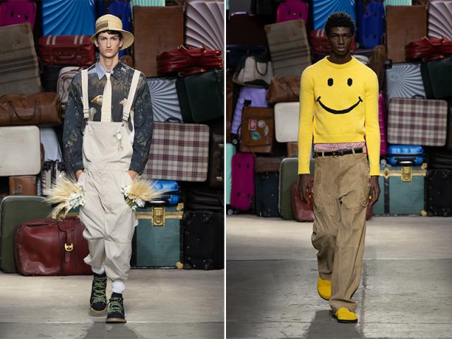 Il mantra riecheggia in sfilata, insieme alle prime reinterpretazioni ironiche, inclusa una tuta da giardiniere, il pullover con lo smile, l’abito da business man tuttofare e la cravatta snellita e allungata fino a terra.