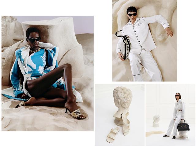 Un elemento comune che li caratterizza è il logo Venna legato all’heritage di Ferragamo, disegnato nel 1930 dall’artista futurista Lucio Venna, e impresso sulle tote bag e sui sandali aperti piatti o leggermente rialzati. Il guardaroba estivo predilige pezzi essenziali e facili da combinare fra di loro.