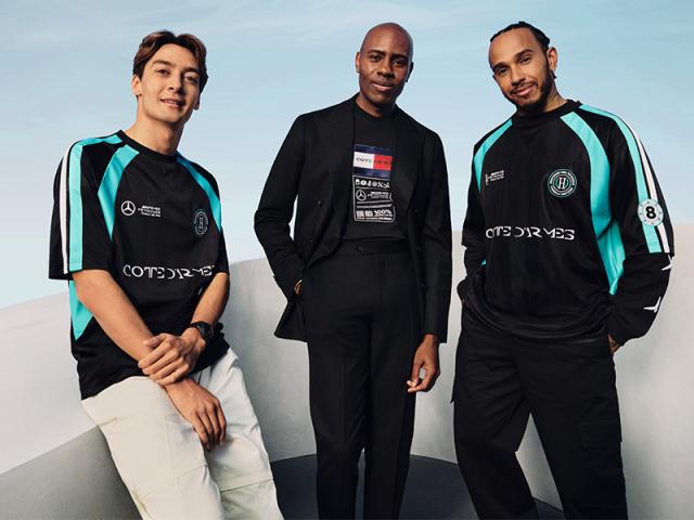 La collezione di abbigliamento e accessori è indossata dalle celebri star automobilistiche George Russell e Lewis Hamilton, modelli affascinanti fotografati da Micaiah Carter con i pezzi chiave della collezione dedicata.