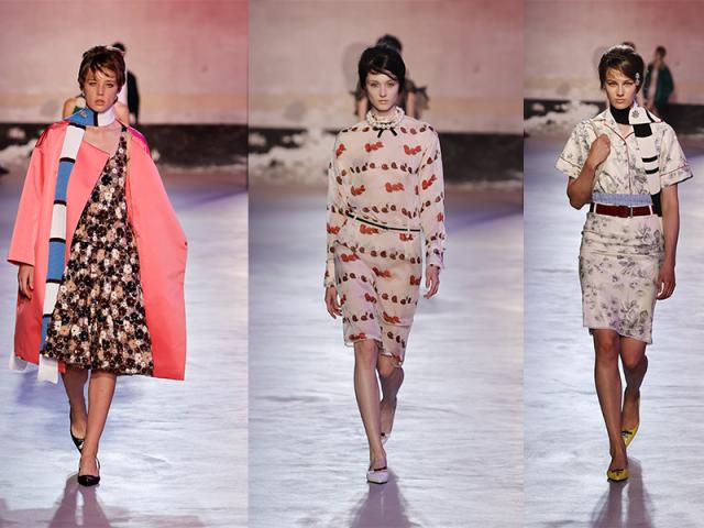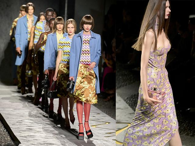 Il viaggio di Etro firmato da Marco De Vincenzo punta anch’esso alle suggestioni del mediterraneo, tradotte con i tipici colori e disegni su vestiti, trasparenze, accessori e gioielli. Tailleur, gonne e abiti svasati, pantaloni a zampa d’elefante, maglie multicolor e jacquard psichedelici sono parte del tour.
