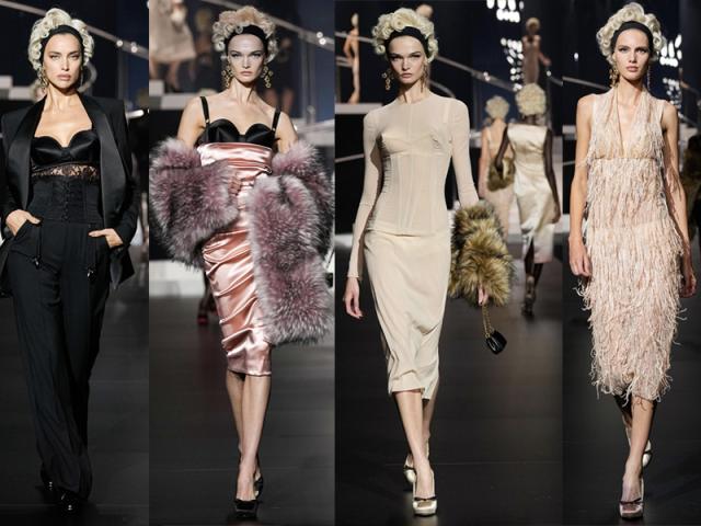 La sensualità all’italiana è il cuore del guardaroba di Dolce&Gabbana, secondo il loro stile più riconoscibile, quello della pin-up come Madonna, che era in prima fila ad applaudire gli abiti a tubino e le innumerevoli applicazioni del reggiseno e del bustier, i look total black, le vesti con frange e cristalli oppure sensuali e grandi rose.