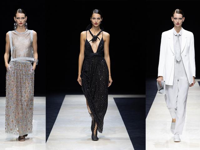 L’universo Emporio Armani proietta nel futuro l’armonia dello scambio fra maschile e femminile. Si parte dagli iconici abiti e giacche sartoria, dai pantaloni fluidi e dalla cravatta, declinati per lei, fino ai parka e trench poggiati su abiti e gonne lunghe o con la camicia ampia portata su pantaloni cavaliere.
