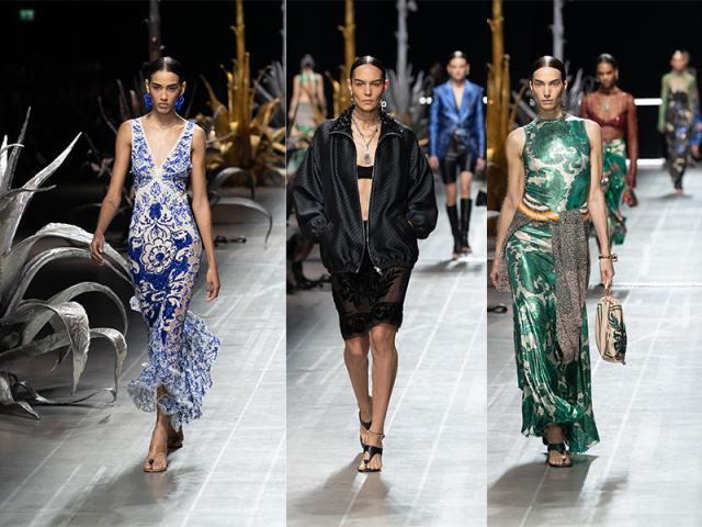 Donatella Versace sceglie silhouette lineari e stampe floreali, zig zag e barocco, quali nuove icone del lusso, da abbinare a bijoux sculotorei ed accessori atistici. Abiti e gonne ad A, ampie camicie business, giacchette e cardigan, oltre pezzi cult decorati in metal mesh o perline.