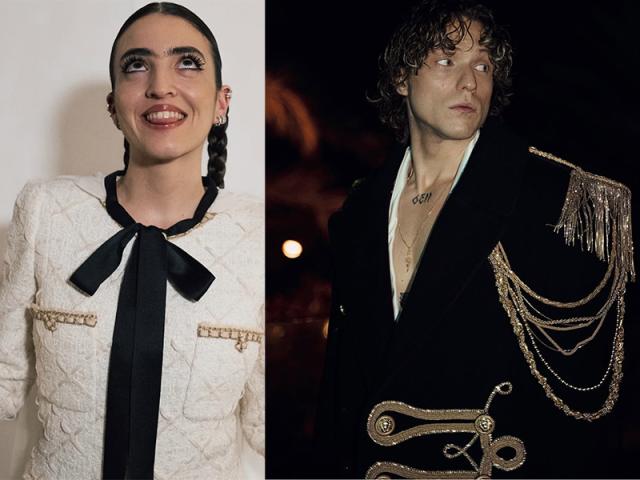 Joan Thiele è vestita Chanel, viceversa Irama è in abito da sera bianco di Balmain.