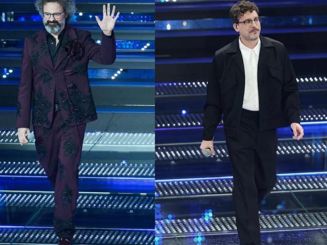 Simone Cristicchi in total look firmato Antonio Marras e Willie Peyote con abito su misura Edith Marcel.