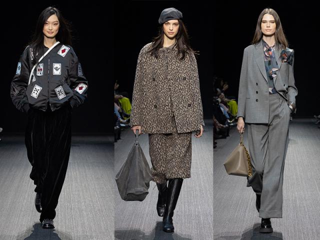 Le scelte materiche rivelano la ricerca tessile, fra lane lavate o animalier spazzolate, intricati jacquard di lana-seta, velluti stampati.