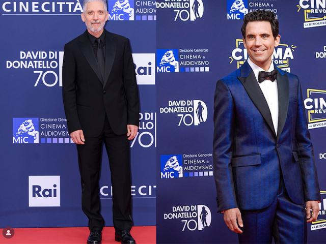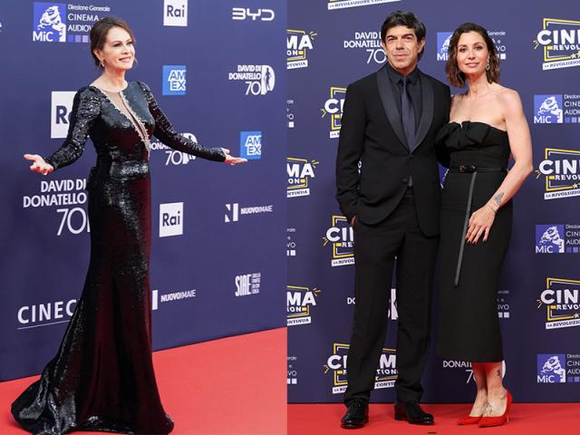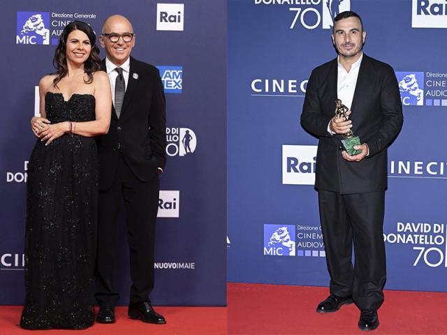 Tra le premiatrici c’è Monica Bellucci in tailleur maschile beige e con cravatta che consegna il Premio Cinecittà, David 70, al regista Giuseppe Tornatore, celebrato dall'Accademia del Cinema Italiano insieme a Cinecittà.