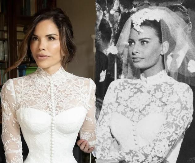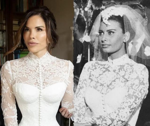 Lauren ha raccontato di aver trovato l’idea definitiva sfogliando vecchie immagini di dive degli anni ’50. È rimasta colpita da uno scatto tratto dal film Houseboat (1958), in cui Sophia Loren indossa un abito in pizzo con collo alto e maniche lunghe. “È lui. È questo l’abito,” avrebbe detto la sposa, trasformando quell’immagine in realtà sartoriale.