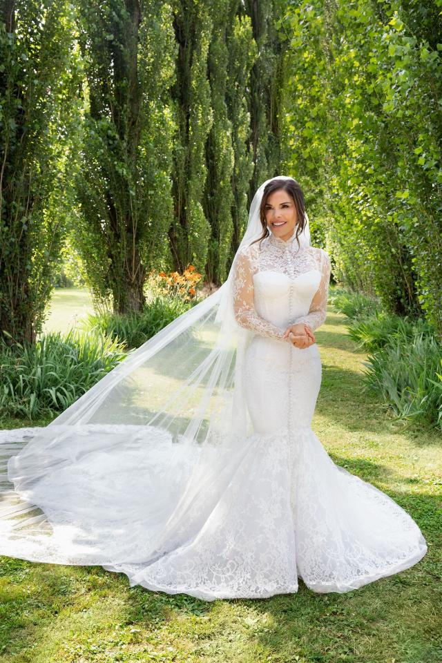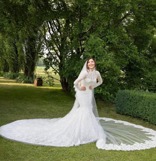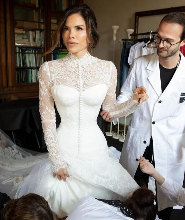 L’abito da sposa, realizzato su misura da Dolce & Gabbana Alta Moda, ha richiesto oltre 900 ore di lavorazione artigianale negli atelier milanesi della maison. Il modello è a sirena in pizzo bianco, con colletto alto, maniche lunghe, bustino corsettato e una gonna svasata impreziosita da 180 bottoni in chiffon che si rincorrono lungo lo strascico. A completare il look, un velo in tulle ricamato che aggiunge teatralità e grazia.