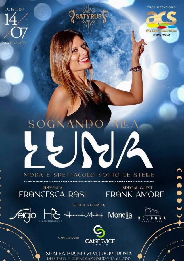Sotto la suggestiva luna dell'estate romana, presso il Satyrus, Scalea Bruno Zevi, incastonato tra Villa Borghese e la facciata della Galleria Nazionale d'Arte Moderna, è andata in scena la quarta edizione di "Sognando alla luna", evento di musica, cultura e sfilate organizzato dal produttore Gino Foglia.