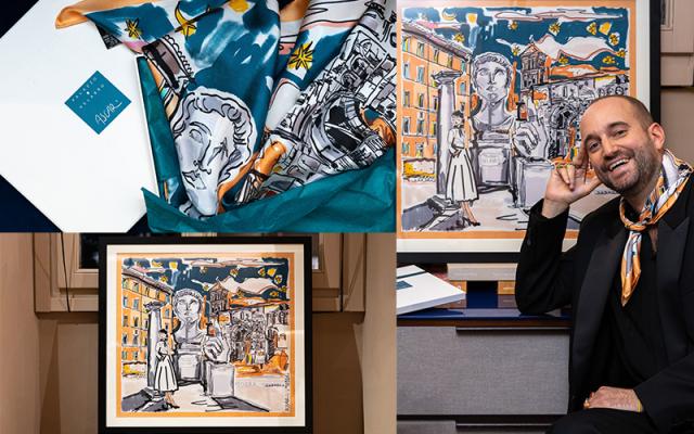 Il foulard diventa così un gesto visivo dell’ospitalità che si fa arte, immaginata come un teatro tascabile dove poter ammirare scorci architettonici, dettagli decorativi e suggestioni urbane, fuse in un racconto illustrato coinvolgente.