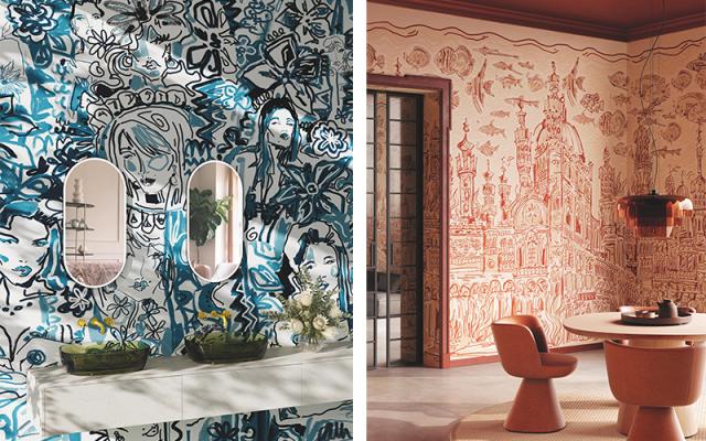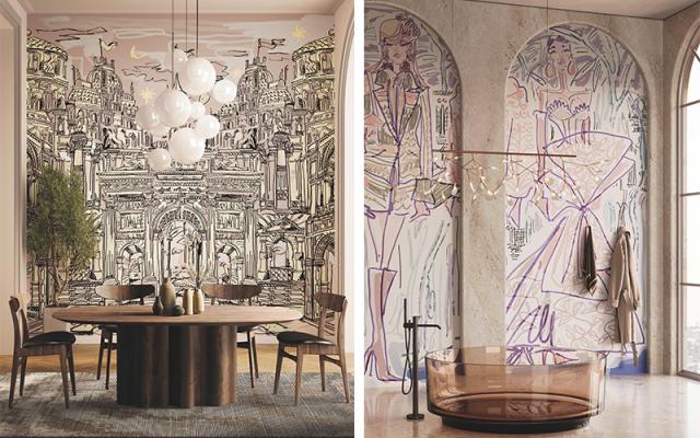 Declinati in più colorazioni, dalle varianti pop a palette più tenui oppure in bianco e nero, i disegni da parete si possono integrare ad ambienti di diverso stile e rappresentano scorci onirici di alcuni punti di riferimento urbani reali.