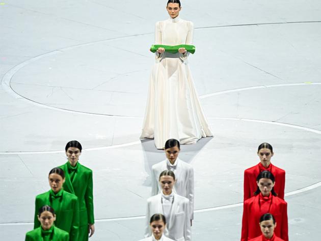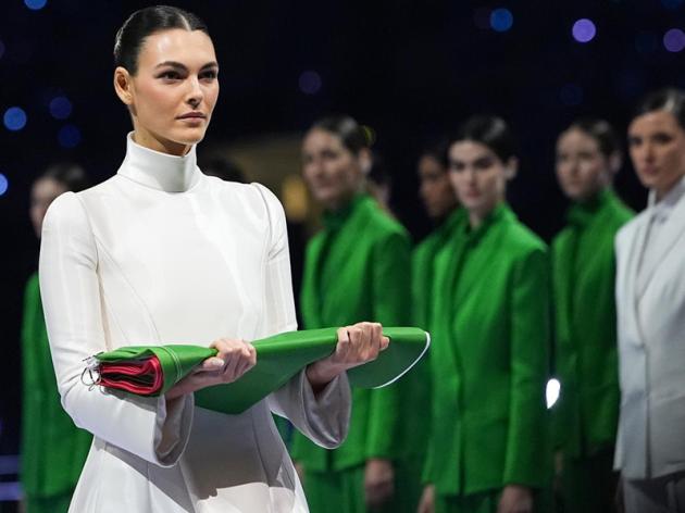 La modella Vittoria Ceretti, testimonial della campagna moda Armani, consegna il vessillo al picchetto d’onore contornata da sessanta modelle in abito monocromatico, alternate sui tre colori della bandiera nazionale italiana.