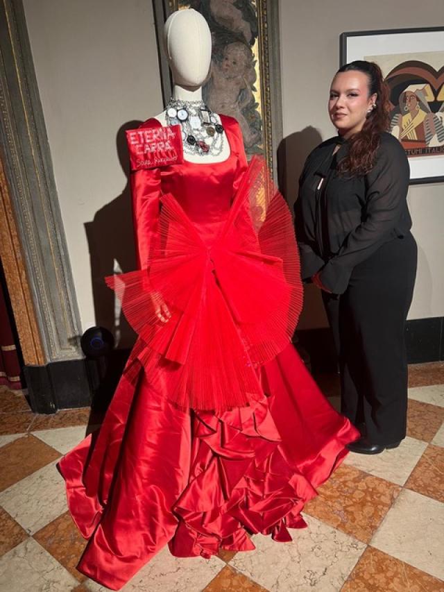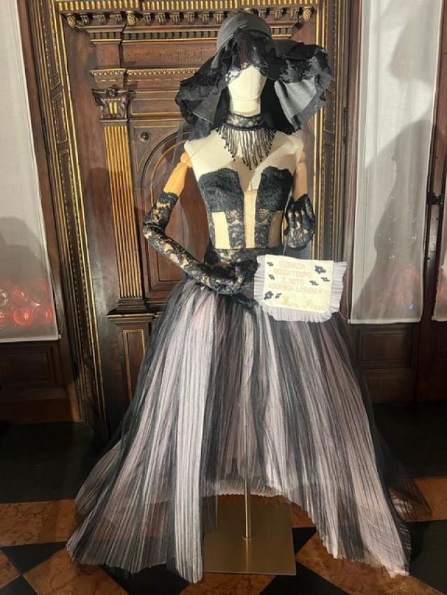 Il mito di Sophia Loren (cioè Eleganza senza Tempo) lo rilegge l’allieva Sara Pizza, strati di merletto resinato per enfatizzare il volume della gonna.