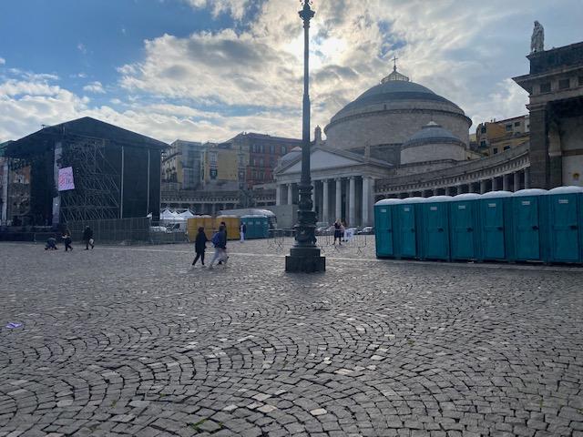 I primi ad arrivare sono stati i cessi, al concerto di Liberato si erano limitati a una fila di gabinetti mobili piazzati davanti la facciata di Palazzo Reale, un insulto agli 8 re rappresentati della dinastie che hanno regnato incastonati nelle nicchie. Era difficile fare peggio, ci sono riusciti con file di gabinetti che segnano il perimetro di una delle piazze più belle al mondo. Una arriva anche a pochi metri dal palco. Non hanno risparmiato neanche la prefettura. Prego neo/prefetto Di Bari, se avesse anche lei un’urgenza impellente e non ce la fa a salire al suo ufficio, si accomodi pure. Spero che in futuro abbia qualcosa da dire sull’abuso che si fa della piazza senza alcun rispetto di un luogo storico. La prego non ci faccia rimpiangere il suo predecessore, l’inerme Palomba.
