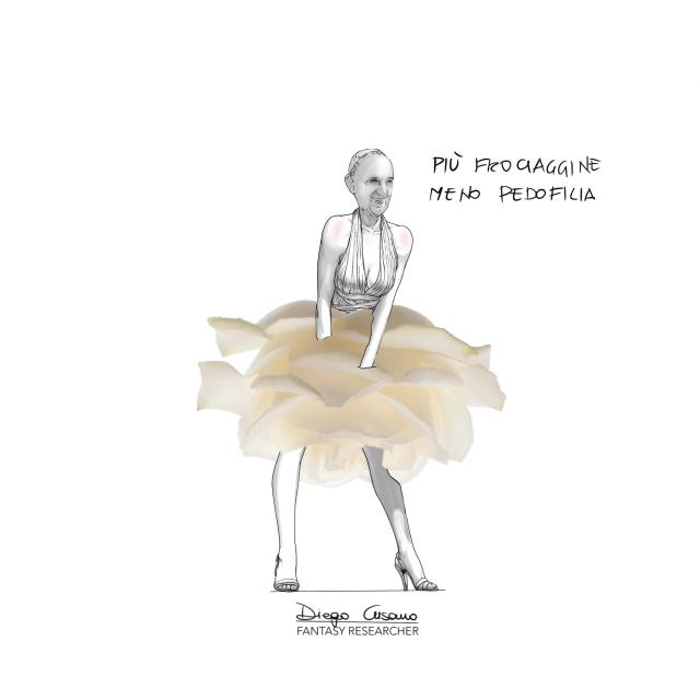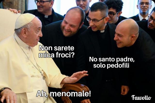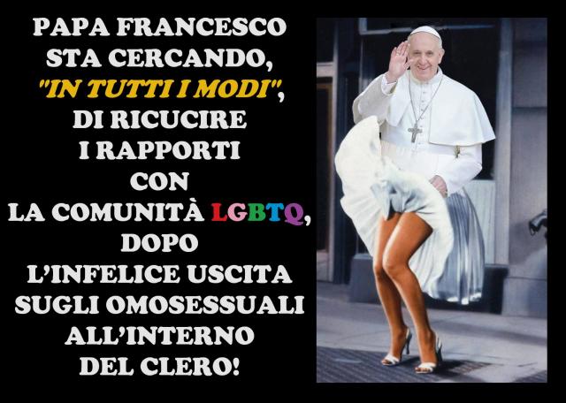 E poi ancora, il Papa dal balcone con una chitarra che suona una canzone famosa che prende in giro i gay. In un altro "Papa Francesco sta cercando in tutti i modi di ricucire i rapporti con la comunità LGBTQ dopo l'infelice uscita sugli omosessuali all'interno del clero". Papa Francesco nei panni dei Simpson: "Siete tutti malati", e "E la smetta di toccarmi il culo". Infine il colpo di grazia: "Più frociaggine e meno pedofilia", e "Non sarete mica fr*ci?", "no santo padre solo pedofili", "Ah, menomale!".