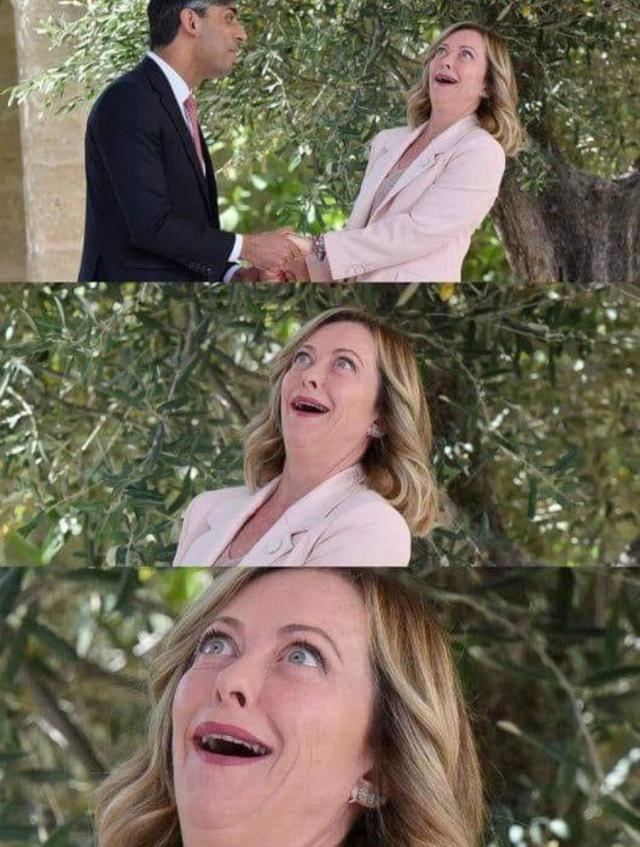 Un vero e proprio tormentone social. L'immagine di Giorgia Meloni in uno stato semi apparente di estasi, dopo aver accolto Rami Sunak a Borgo Egnazia per il G7, continua a fare il giro del web. La sua espressione è stata riutilizzata in tantissimi meme, che continuano a spopolare su Instagram e Facebook. Dai meme con Rocco Siffredi, passando all'apparizione del premier nel cast di Nymphomaniac e arrivando al flirt con il già citato Rami Sunak.