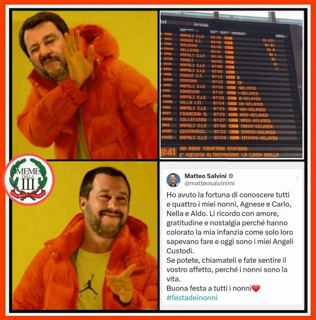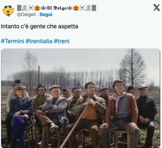 Il web come spesso succede in questi casi si è scatenato con dei meme uno più divertenti dell'altro per sdrammatizzare sulla questione. C'è chi usa il post di auguri per la festa dei nonni da parte di Salvini nella mattinata di ieri: "Ci scusiamo per i disagi, il ministro è impegnato a fare gli auguri ai nonni", "Andate a piedi". L'ironia dei social porta anche scenari surreali come il post con un guerriero che indossa un’armatura medievale mentre aspetta il treno sulla banchina: "Quando il tuo treno porta 278 anni di ritardo". In un altro meme viene punzecchiato il ministro Salvini: "Chi l'ha visto?".