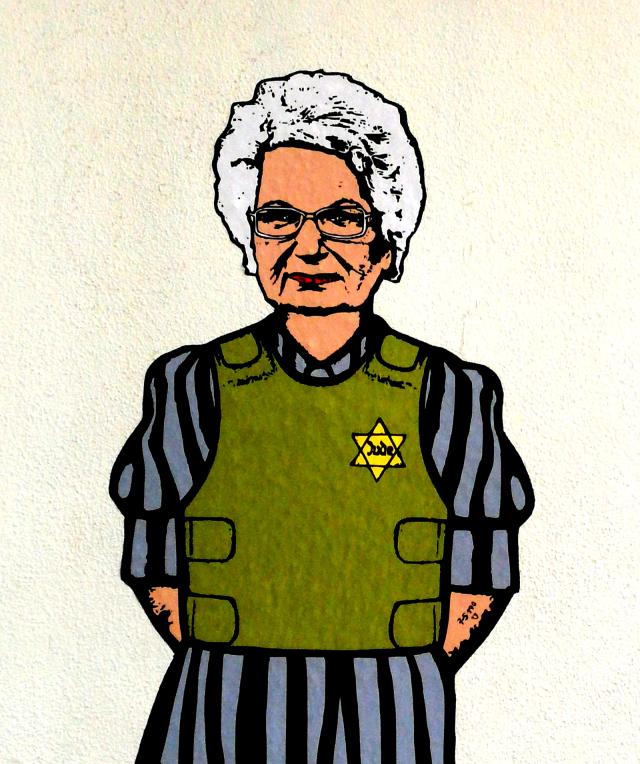 Nel murale la senatrice a vita è stata ritratta con le braccia dietro la schiena, dalle quali si scorge il numero di matricola 75190, il tatuaggio che i nazisti le fecero da bambina nei campi di concentramento di Auschwitz-Birkenau. Modiano, tra gli ultimi testimoni dell'Olocausto, appare invece con una valigia su cui è stato trascritto il numero di matricola B7456.