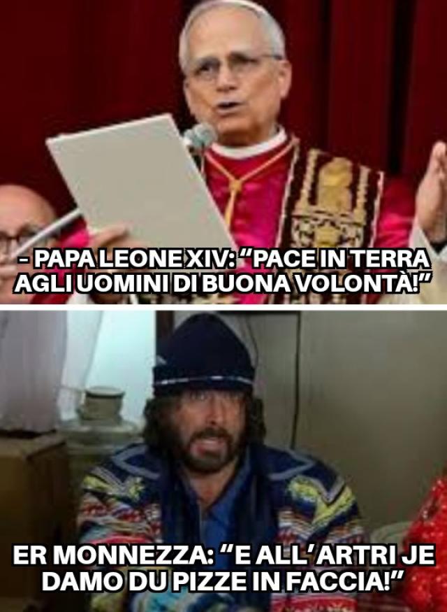 "È Papa Leone XIV o Claudio Ranieri?", si chiedono gli utenti che nei MEME riportano la foto del Pontefice Robert Francis Prevost, appena affacciatosi su Piazza San Pietro poco dopo la sua elezione accanto una foto del tecnico della Roma, vestito anche lui in abito talare, in identica posa e incredibilmente simile a Leone.