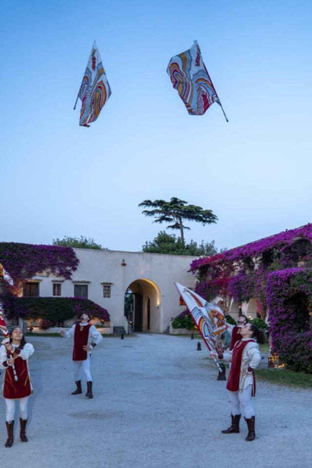 Sbandieratori con lo stendardo del casato accoglievano gli ospiti da ogni dove. Torre Sanseverino é magnifica mentre una palla di fuoco si tuffa a mare nel golfo di Baia. Anfitrione della sua dimora storica Enrico Micillo. E’ la festa a sorpresa per Nicoletta Piergentili, penalista fuoriclasse. Festa rimandata dal 23 maggio, giorno dell’ultima partita del Napoli, scudetto vinto per un soffio. Ha creato l’attesa della suspence. Party riuscitissimo davanti a una cascata d’acqua ( virtuale ma sembra vera),