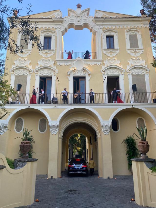 Un matrimonio tra storia, nobiltà e modernità: nella Chiesa del Gesù Nuovo, una volta palazzo cinquecentesco del Principe di Salerno Roberto Sanseverino, un antenato di famiglia, entrava la sposa ( più bella cosa non c’è), un cammino simbolico lungo la navata, il pavimento di marmo intarsiato con gli stemmi di famiglia.