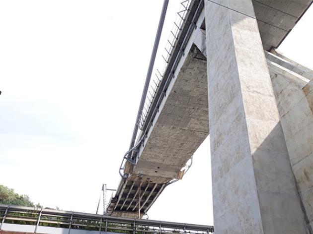 Il ponte sembra una struttura fatiscente post moderna di una ex centrale atomica. Osservandolo da sotto sembrano visibili vari rattoppi, pecette. In molti punti ci sono sono dei quadrati dipinti di rosso con dei numeri. I plinti del ponte sono inseriti tra i tetti delle case, delimitandone e modificandole il perimetro.
