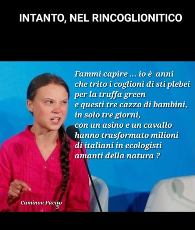 Immancabile il riferimento a Greta Thunberg, visto che dalla vicenda emerge anche un tono "green": "Fatemi capire, io è anni che trito i coglioni di sti plebei per la truffa green e questi tre cazzo di bambini, in solo tre giorni, con un asino e un cavallo hanno trasformato milioni di italiani in ecologisti amanti della natura?". E poi la presenza di Alessandro Gassman: "Pronto polizia, ho visto il mio vicino che passeggiava nel bosco. Inoltre beveva acqua di fonte e ha cagato in un prato".