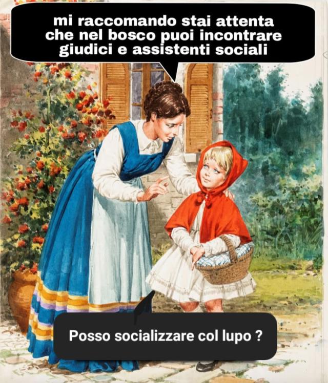 Ed infine, ecco Cappuccetto Rosso e il monito che le viene dato: "Mi raccomando stai attenta che nel bosco puoi incontrare giudici e assistenti sociali". E Cappuccetto rosso risponde: "Posso socializzare col lupo?".