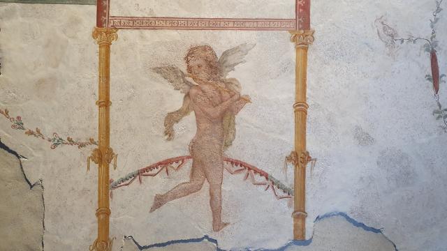Frammento di affresco con padiglione coronato da elementi vegetali e tetto a doppia falda decorato da grifi; al centro del padiglione amorino nudo in atto di suonare il flauto traverso. Probabile provenienza dall’ambiente 12 di Villa Arianna.